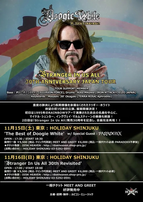 この度、Doogie White本人、並びに彼の医師の判断を受け、ルビコン・ミュージック主催により4月19日 (土) 並びに4月20日 (日) に予定しておりました「STRANGER IN US ALL 30th ANNIVERSARY JAPAN TOUR」を、下記の日程へ延期させて頂く事となりました。